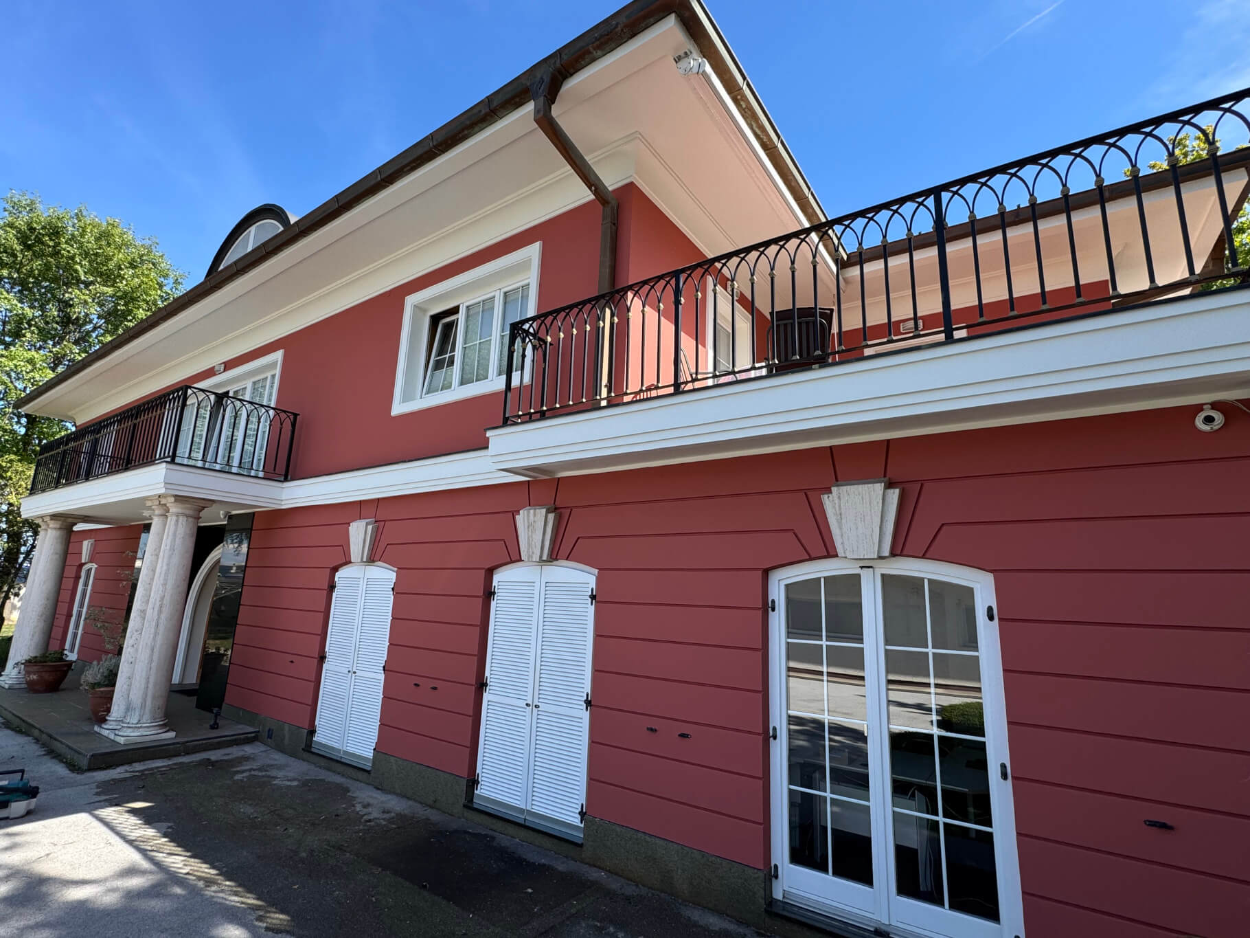 Prethodni izvođač ugradio je materijale namijenjene interijeru na područje eksterijera. Glatka površina nije bila prikladna za vanjske uvjete, što je kroz godine dovelo do ljuštenja, gubitka adhezije i narušavanja izgleda pročelja. Skidanje starih slojeva moralo se izvesti pažljivo kako se ne bi oštetili originalni fasadni detalji i oblici koje je vlasnik želio sačuvati.